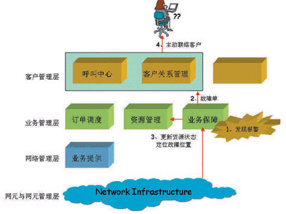 業(yè)務(wù)保障系統(tǒng)(如圖3所示)。該系統(tǒng)會隨時監(jiān)控網(wǎng)絡(luò)的可用性,當(dāng)網(wǎng)絡(luò)上發(fā)現(xiàn)故障的時候,首先會產(chǎn)生一個故障單,通報故障處理系統(tǒng)和CRM系統(tǒng),同時也會跟資源管理系統(tǒng)進行交互,來實現(xiàn)對資源狀態(tài)的更新。同時在資源管理系統(tǒng)里面定位故障的位置,為盡快修復(fù)故障提供便利的手段。前端系統(tǒng)在監(jiān)測到故障的信息以后,能夠主動聯(lián)絡(luò)到客戶,并通知客戶由于某種原因客戶所購買的業(yè)務(wù)受到一些影響,以及運營商承諾在多長時間內(nèi)修復(fù)故障。