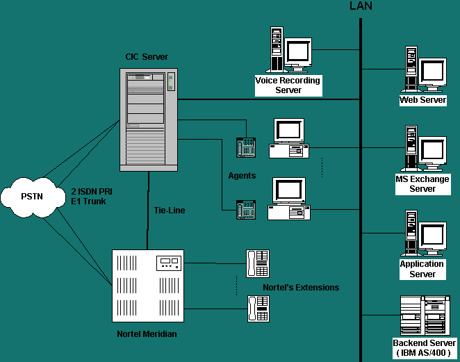 一體化(All-in-One)的CIC系統(tǒng)內(nèi)部集成了各項(xiàng)功能模塊,如通信服務(wù)器、統(tǒng)一消息隊(duì)列(UMS)、ACD、IVR、CTI、語(yǔ)音記錄(Recorder)、語(yǔ)音留言(Voice Mail)等等功能,為了分擔(dān)系統(tǒng)負(fù)荷,并考慮現(xiàn)有資源的充分合理應(yīng)用,集成美國(guó)友邦保險(xiǎn)公司上海分公司現(xiàn)有電子郵件系統(tǒng)和Web服務(wù)功能,在此基礎(chǔ)上實(shí)現(xiàn)了網(wǎng)上聊天(Web Chat)、網(wǎng)上回叫(Web Callback)等功能。為了與現(xiàn)有通信資源的互連互通,CIC還采用了Tie Line技術(shù)連通了美國(guó)友邦保險(xiǎn)公司上海分公司的PABX系統(tǒng),實(shí)現(xiàn)客戶服務(wù)中心話務(wù)員與辦公人員之間的溝通。