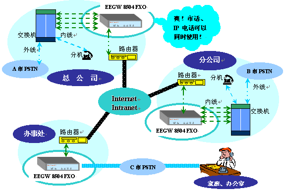 EEGW 8504網(wǎng)關(guān)利用現(xiàn)有的IP網(wǎng)絡(luò)資源實(shí)現(xiàn)語(yǔ)音通信,它提供4條線路可以連接PSTN網(wǎng)或企業(yè)交換機(jī)。它由于只需支付上網(wǎng)費(fèi)而大幅度減少話費(fèi)支出,這是實(shí)現(xiàn)企業(yè)總公司與分公司間、SOHO族異地間通訊的最經(jīng)濟(jì)方案。