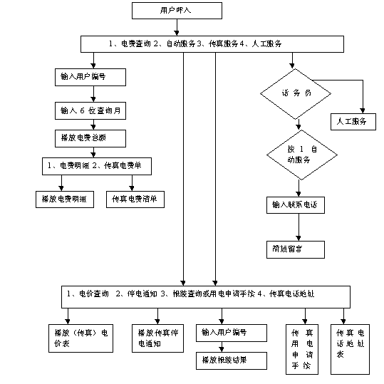 根據(jù)供電局的業(yè)務需求,設置了用電信息查詢與傳真、電管信息查詢與傳真、報裝業(yè)務查詢與傳真、停電信息查詢與傳真等自動查詢功能,同時根據(jù)部分用戶的特殊需求設置了人工查詢、人工投訴、人工報裝、人工報障、轉(zhuǎn)接調(diào)度、三方通話功能、114總機調(diào)度功能,自動呼出功能實現(xiàn)了對欠費用戶電話或傳真催繳服務,同時將停電信息在第一時間傳遞給客戶。