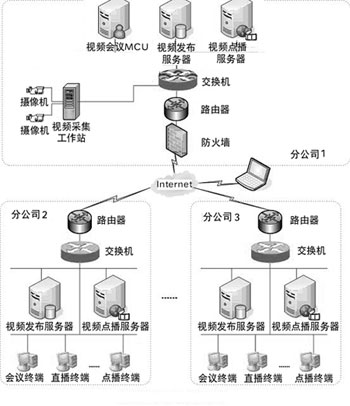 旺城國際控股集團(tuán)視頻會(huì)議系統(tǒng),其Internet出口帶寬為10M,因?yàn)樵摮隹谶要傳輸各種業(yè)務(wù)數(shù)據(jù),所以實(shí)際用于視頻會(huì)議的帶寬大概在5M左右,各分公司的接入速率在384Kbps~768Kbps之間。方案采用一臺(tái)高性能服務(wù)器作為MCU,以確保支持五會(huì)場的遠(yuǎn)程接入。同時(shí),在五個(gè)分公司配置一臺(tái)直播服務(wù)器,支持各地Intranet(均為100M帶寬)內(nèi)的電腦用戶接收會(huì)議現(xiàn)場組播,并錄制、上傳到點(diǎn)播服務(wù)器備份以供會(huì)后研討。整個(gè)視頻會(huì)議的包括: