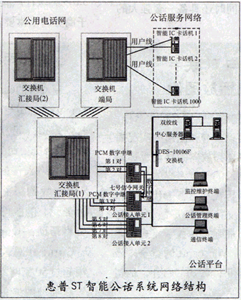 日前,在大連市公用電話系統(tǒng)改造方案的征集中,惠普lh6000產(chǎn)品和超級(jí)保障解決方案脫穎而出,該方案是由沈陽(yáng)都市通網(wǎng)絡(luò)有限公司設(shè)計(jì),滿足了大連市智能公用電話系統(tǒng)改造的穩(wěn)定性、可擴(kuò)展性和實(shí)用性需求。該系統(tǒng)具有在線集中認(rèn)證、集中統(tǒng)計(jì)、集中計(jì)費(fèi)和集中管理功能,從而使公話運(yùn)營(yíng)者提高了服務(wù)質(zhì)量、管理水平和盈利能力;萜誗T智能公用電話系統(tǒng)主要由智能IC卡式終端話機(jī)、公話平臺(tái)和系統(tǒng)管理中心三部分組成,該系統(tǒng)網(wǎng)絡(luò)結(jié)構(gòu)如圖所示。