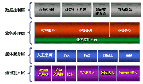 CALL CENTER的服務形式是:客戶通過電話、Internet、傳真等通訊媒體進入客戶服務中心,得到自動語音服務,或人工座席的服務,除了傳統(tǒng)的語音交流以外還可以利用共享技術進行可視化的交流。通過客戶服務中心的調(diào)度策略,股民的服務請求被送到相應的人員、部門和地區(qū),及時對服務請求進行處理。系統(tǒng)中人機自動切換、等待時長提示、話務協(xié)同服務、智能路由分配、大用戶優(yōu)先進入、數(shù)據(jù)與呼叫同步轉移等功能保證了服務的人性化;當服務請求由一個人難以完成時,可多人同時協(xié)同對客戶進行服務。通過客戶服務中心,客戶只要撥打 "一個號碼,一次電話",就可以獲得所需要的全部服務。