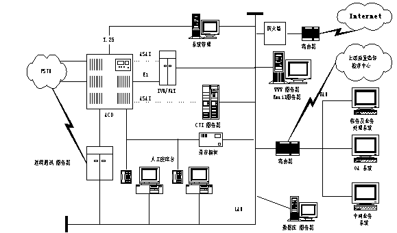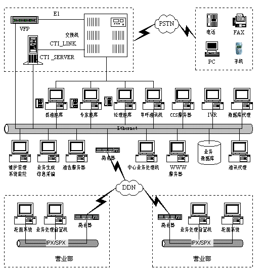結構模式 : 采用全省統(tǒng)一平臺模式的板卡式分布系統(tǒng)。各地市行客戶服務中心使用統(tǒng)一的號碼95588接入系統(tǒng)。與帳務處理有關的交易均通過網(wǎng)關發(fā)送到省行大機處理;人工座席業(yè)務等全部在當?shù)乜蛻舴⻊罩行奶幚?