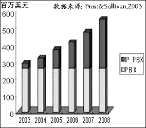 這幾年,IP電話的需求在不斷升溫,尤其在2003年呈快速增長(zhǎng)趨勢(shì)。目前,全球IP電話市場(chǎng)容量每年為10億美元,預(yù)計(jì)到2008年,IP電話的市場(chǎng)份額將超過傳統(tǒng)的PBX。據(jù)思科公司溫帶策經(jīng)理介紹,思科在前4年,向全球銷售了100萬(wàn)臺(tái)IP電話,而在2003財(cái)年僅僅一年時(shí)間里,就銷售了100萬(wàn)臺(tái)IP電話。