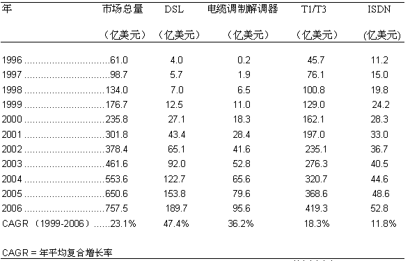 根據(jù) Frost & Sullivan 的預(yù)測(cè), 從1999年到2006年,美國寬帶接入服務(wù)市場(chǎng)的年平均復(fù)合增長率為23.1%。預(yù)計(jì)在2006年, 美國寬帶接入服務(wù)的市場(chǎng)總額將高達(dá)757.5億美元。 其中DSL接入服務(wù)的增長幅度最大,年平均復(fù)合增長率高達(dá)47.4%,而DSL市場(chǎng)總額將增長為189.7億美元,占整個(gè)市場(chǎng)的26.2%。 電纜調(diào)制解調(diào)器服務(wù)市場(chǎng)的年平均復(fù)合增長率也將高達(dá)36.2%,市場(chǎng)規(guī)模將達(dá)到95.6億美元,占整個(gè)寬帶接入市場(chǎng)的12.6% 。而T1/T3數(shù)據(jù)接入專線由于其技術(shù)成熟,在企業(yè)用戶中接受度頗高,它的年平均復(fù)合增長率預(yù)計(jì)約為18.3%,市場(chǎng)總額將增至419.3億美元,在整個(gè)寬帶接入市場(chǎng)中還是處于統(tǒng)治地位,占整個(gè)市場(chǎng)的55.3%。 而ISDN接入服務(wù)的增長則較為緩慢,年平均復(fù)合增長率將僅為11.8%,市場(chǎng)規(guī)模約是52.3億美元,占整個(gè)寬帶接入市場(chǎng)的5.9%。