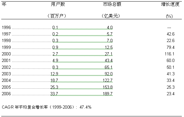 圖一: 美國寬帶接入服務(wù)市場(chǎng)的增長歷史和預(yù)測(cè) 1996-2006