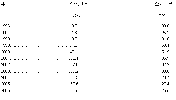 圖三表示出美國DSL市場(chǎng)企業(yè)和個(gè)人用戶所占的比例。在1999年以前,企業(yè)用戶占了這個(gè)市場(chǎng)的絕大部分,這一時(shí)期服務(wù)商提供的主要是針對(duì)企業(yè)用戶的HDSL服務(wù)。而從1999年以后隨著ADSL技術(shù)的成熟和普及,個(gè)人用戶正在成為市場(chǎng)上的主力軍。1999年,個(gè)人DSL用戶僅占總用戶數(shù)的31.6%, 企業(yè)用戶,主要是中小企業(yè)用戶占DSL總用戶數(shù)的68.4%。而到了2000年,美國市場(chǎng)上48.1%的DSL用戶為家庭用戶,企業(yè)用戶的比例下降為51.9%。Frost & Sullivan預(yù)測(cè),到2006年,73.5%的DSL用戶將是個(gè)人家庭用戶,企業(yè)用戶將僅為26.5%。