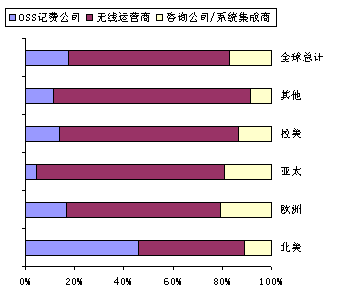圖1、無(wú)線(xiàn)OSS計(jì)費(fèi)市場(chǎng):2000年全球按照地區(qū)劃分的不同公司類(lèi)型的整體市場(chǎng)收入估計(jì)(百萬(wàn)美元)