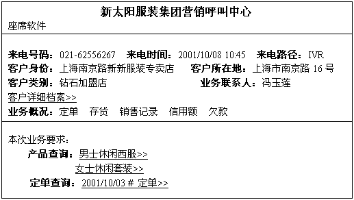 呼叫中心是以CTI技術(shù)為根本的,它的長項就在于能把計算機系統(tǒng)與電話系統(tǒng)集成起來。在呼叫中心所集成的計算機系統(tǒng)中,除了呼叫中心本身的應(yīng)用軟件外,更重要的就是與ERP(企業(yè)資源計劃)系統(tǒng)集成后產(chǎn)生的功能強大的座席端應(yīng)用軟件。實際上,與ERP系統(tǒng)無縫連接的座席端應(yīng)用軟件,很容易就能擴充為一個簡單的CRM(客戶關(guān)系管理)系統(tǒng)。這時,呼叫中心就真正成了服裝生產(chǎn)商整個運營管理體系中的溝通樞紐和響應(yīng)中心。
