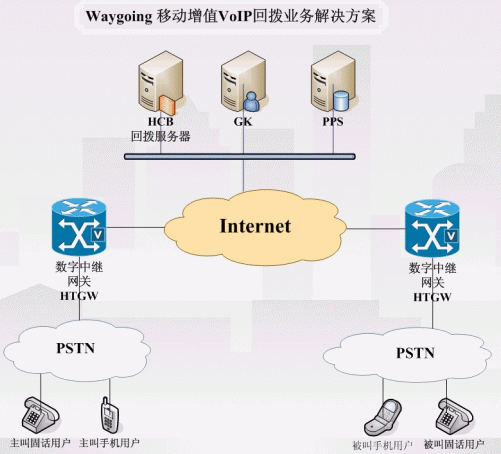 移動通信給我們的生活帶來了很大的便利,但由于其昂貴的使用費用,抑制了用戶的通話量。偉功通信推出的Waygoing移動增值VoIP回撥業(yè)務解決方案,面向部分已實現(xiàn)通信單向收費或來電暢聽的手機用戶群,手機用戶可以加入回撥業(yè)務,在更大程度上節(jié)省手機用戶的本地和長途通話費用。本方案采用新興的VoIP技術(shù),基于Web方式的客戶服務,給客戶的開戶、充值等帶來了非常大的便利,也為各級電信運營商提供了高效的競爭利器。