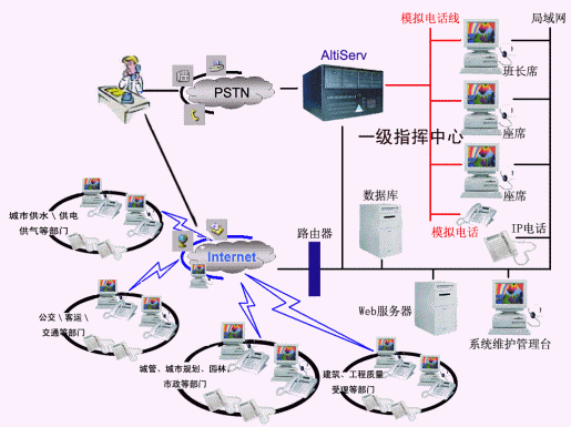 該熱線系統(tǒng)能與Internet、數(shù)據(jù)庫系統(tǒng)很好地集成,實(shí)現(xiàn)城市各級部門之間數(shù)據(jù)共享和各種其它不同的業(yè)務(wù)功能,以建設(shè)部為中心、各職能聯(lián)動2級網(wǎng)絡(luò)系統(tǒng)和搶修維護(hù)服務(wù)端三個部分組成,利用AltiCenter基于IP的分布式呼叫中心技術(shù),可以實(shí)現(xiàn)建設(shè)部12319服務(wù)中心,屬下各個職能部門建立異地分中心,利用現(xiàn)有的PSTN電話網(wǎng)/INTERNET互聯(lián)網(wǎng),將1,2,3級網(wǎng)絡(luò)組成一個集語音和數(shù)據(jù)傳輸為一體的多媒體網(wǎng)絡(luò)系統(tǒng),并提供對任何方式的服務(wù)進(jìn)行全程錄音、質(zhì)檢功能,最終結(jié)果反饋到統(tǒng)一指揮服務(wù)中心。