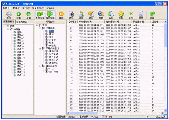 主要是對錄音進行管理,分為錄音查詢和錄音操作兩大部分。錄音查詢除了提供常規(guī)的按條件組合查詢外,還提供了人性化的常用查詢,系統(tǒng)已經(jīng)內(nèi)置了很多常用查詢,例如:當日查詢,您只要直接選擇當日查詢,就可以馬上開始查詢當日的所有錄音,減少您每次輸入查詢條件的工作量,并且還可以靈活的自定義常用查詢,充分滿足您的查詢要求。錄音操作提供了方便快捷的操作方式。批量數(shù)據(jù)的處理能力可以讓用戶以最快的速度從煩瑣的工作中解脫出來。詳細的記錄信息可以滿足所有用戶的要求,特定信息的加入可以滿足特殊行業(yè)的使用,如呼叫中心行業(yè)、服務(wù)臺、傳呼臺等。