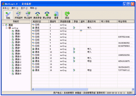 Netlog系統(tǒng)中控制臺是一個統(tǒng)一配置和管理的平臺,可以部署在網(wǎng)絡(luò)內(nèi)的任意一臺主機上,各個功能模塊都可以單獨工作,也可以同時使用,控制臺所有模塊可以通過系統(tǒng)導航(ToolBar)來引導啟動。用戶可以通過控制臺操作網(wǎng)絡(luò)上所有記錄服務(wù)、數(shù)據(jù)服務(wù)和文件服務(wù)?刂婆_作為最終用戶終端可以完成用戶的所有操作,設(shè)置每個服務(wù)器甚至每個通道的屬性、執(zhí)行各種用戶操作、指定服務(wù)的工作方式、錄音查詢、錄音管理、輸出報表、排班等?刂婆_根據(jù)用戶權(quán)限的不同限定用戶的操作,更好的保障了系統(tǒng)的運行和語音記錄文件的安全。