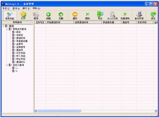 針對備份語音記錄文件(包括DVD光盤備份和磁盤備份)查詢、管理功能,查詢過程以及錄音操作與錄音管理功能模塊完全相同,此外還提供了恢復的功能。