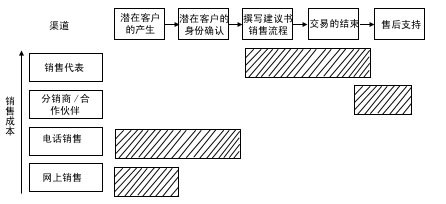 渠道整合強調(diào)在一個銷售過程中分工的不同給企業(yè)帶來更多的利潤,將銷售過程的任務(wù)一一分配給不同成本的渠道來完成。銷售過程的中間環(huán)節(jié)——面對面的銷售和交易的達(dá)成,通常需要由成本較高的區(qū)域銷售代表和分銷伙伴來完成,客戶的產(chǎn)生及身份的確認(rèn)和售后服務(wù)環(huán)節(jié)通常由低成本渠道完成,F(xiàn)在,我們對照圖4來比較一下: