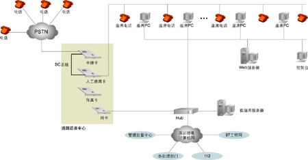 系統(tǒng)的核心是話路語音中心,主要實(shí)現(xiàn)兩大功能: 一是實(shí)現(xiàn)180系統(tǒng)的話路語音平臺(tái); 二是實(shí)現(xiàn)與電話網(wǎng)絡(luò)的接口。以1臺(tái)Pentium級(jí)工控機(jī)作為處理平臺(tái),2塊30線數(shù)字中繼語音處理卡,1塊帶振鈴器的24線模擬座席電話轉(zhuǎn)接卡,1塊4路傳真卡,卡間以語音處理行業(yè)的標(biāo)準(zhǔn)總線SC總線相連。系統(tǒng)與電信網(wǎng)絡(luò)的接口采用E1數(shù)字中繼線,信令方式采用中國一號(hào)信令為隨路信令,工控機(jī)用TCP/IP協(xié)議與局域網(wǎng)相連。