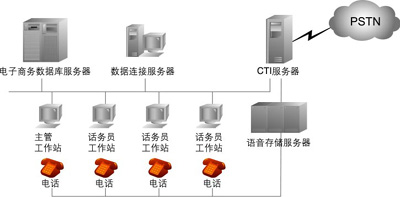 中型呼叫中心:座席代表在50~100之間。據(jù)專業(yè)數(shù)據(jù)統(tǒng)計(jì)公司預(yù)測(cè),中型系統(tǒng)需求量最大,因此不少呼叫中心軟、硬件開發(fā)商對(duì)準(zhǔn)這一目標(biāo)進(jìn)行開發(fā)。這種系統(tǒng)結(jié)構(gòu)相對(duì)簡(jiǎn)單,投資也少,容易被中、小企業(yè)所接受。目前我國的一些公司開發(fā)系統(tǒng)多屬于此種類型。它可以省掉大型交換機(jī)的投資,而利用PBX與CTI服務(wù)器和業(yè)務(wù)代表座席直接相連,業(yè)務(wù)代表席同時(shí)與應(yīng)用服務(wù)器相連,客戶資料也存在應(yīng)用服務(wù)器中,可實(shí)時(shí)地將接入電話的客戶姓名自動(dòng)在計(jì)算機(jī)屏幕上彈出。CTI服務(wù)器一般由CTI硬件開發(fā)商的板卡和PC組成,其擴(kuò)容和增加功能也比較方便,成本也低,因此是一種投資小、見效快、升級(jí)也很靈活的系統(tǒng)。
