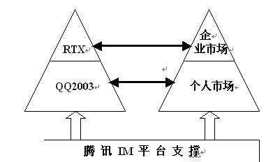 1、從QQ2003到RTX是對(duì)IM市場(chǎng)的全方位介入。騰訊推出革命性的QQ2003,緊接著又啟動(dòng)RTX新品牌進(jìn)軍企業(yè)市場(chǎng),標(biāo)志著其不滿足于將自身定位為娛樂及時(shí)信息平臺(tái)和服務(wù)提供商,而是對(duì)商務(wù)市場(chǎng)和個(gè)人市場(chǎng)進(jìn)行理性細(xì)分后的一種戰(zhàn)略決策,向兩類不同的用戶推出不同的品牌,提供不同的服務(wù)(如下圖),既保證了不同用戶的需求特質(zhì),又有效避免了品牌混亂。