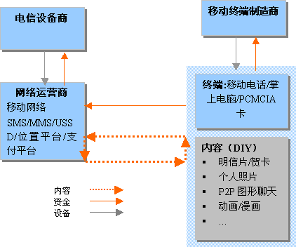 除了MMS本身的技術(shù)驅(qū)動(dòng)外,內(nèi)容提供商和應(yīng)用提供商對(duì)終端用戶的影響很大,可以說,應(yīng)用決定市場,P2P的MMS是基本消費(fèi),而商業(yè)MMS應(yīng)用可以說是"額外消費(fèi)",在這種背景下,六個(gè)環(huán)節(jié)的互動(dòng)關(guān)系頗為復(fù)雜和微妙。