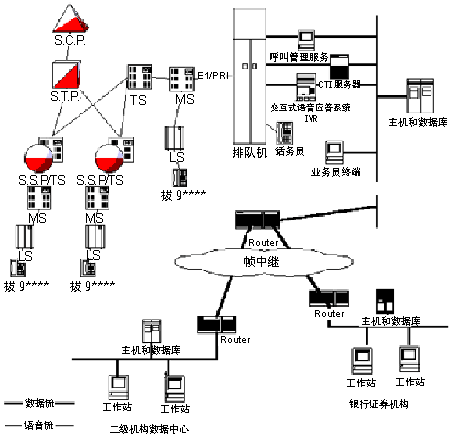 該公司全國客戶呼叫中心的建設(shè)包括兩大部分,一部分是在上海設(shè)立服務(wù)于全國的電話呼叫中心,為客戶提供全國統(tǒng)一的服務(wù);另一部分是在全國建立該公司專用數(shù)據(jù)網(wǎng)絡(luò)系統(tǒng),該公司分支機(jī)構(gòu)與總部之間通過專用數(shù)據(jù)傳輸網(wǎng)絡(luò),進(jìn)行數(shù)據(jù)傳輸。經(jīng)研究分析,建議在該公司全國呼叫中心服務(wù)系統(tǒng)的方案中,對于語音的傳遞,該公司將采用中國電信為其提供的PSTN網(wǎng)接入全國呼叫中心,客戶只需撥打信息產(chǎn)業(yè)部為該公司核配的短號(hào)碼9****,利用中國電信的智能網(wǎng)系統(tǒng)即可及時(shí)有效地接入到該公司上海的電話呼叫中心,得到優(yōu)質(zhì)高效的語音服務(wù)。系統(tǒng)如下圖所示: