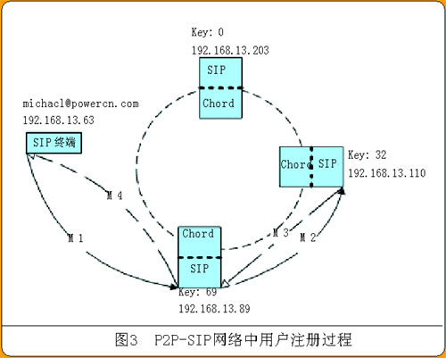 在本例中,SIP URI是michael@powercn.com,假定其哈希值是17,PN的Chord層會(huì)查找到負(fù)責(zé)處理該請求的PN Key值是32,find_responsible_pn(user)返回該P(yáng)N的“IP地址∶端口”——192.168.13.110:5060。PN的SIP層比較該值發(fā)現(xiàn)不是自己,就將注冊請求轉(zhuǎn)發(fā)到該“IP地址∶端口”,如圖3中M2所示。