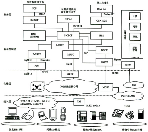 接入層支持各種有線和無(wú)線終端。固定和無(wú)線SIP終端可通過IP接入網(wǎng)直接鏈入,非SIP終端(如H.323)必須通過TAI(終端適配接口)完成H.323和SIP的轉(zhuǎn)換才能接入IP接入網(wǎng)。各種寬帶IP終端可通過MGW、MGCF、SGW實(shí)現(xiàn)與PSTN/PLMN域的傳統(tǒng)窄帶TDM(時(shí)分復(fù)用)終端實(shí)現(xiàn)互通。