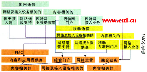 總之,在FMC新配置的價值鏈中,應(yīng)用和內(nèi)容的作用非常重要,因為他們在融合時將價值鏈中的各個部分連接起來。因此,可以認為內(nèi)容和應(yīng)用的建立、積累將會推動增值FMC業(yè)務(wù)的發(fā)展。今后隨著在內(nèi)容和業(yè)務(wù)領(lǐng)域?qū)⒊霈F(xiàn)更多不同的參與者,如內(nèi)容提供商、應(yīng)用提供商和中間件提供商,F(xiàn)MC價值鏈將進一步得到更深層次的合作、擴張和合并。這些在新的價值鏈中出現(xiàn)的更多獨立但又不同的實體,將直接反映FMC融合的特征。