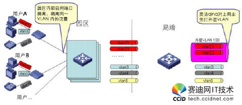 考慮到業(yè)務(wù)特性,上網(wǎng)業(yè)務(wù)通常需要對(duì)用戶(hù)進(jìn)行精細(xì)化管理,而對(duì)IPTV業(yè)務(wù)通常采用較粗獷的管理模式,因此我們建議通過(guò)如下方式來(lái)做VLAN規(guī)劃:對(duì)上網(wǎng)業(yè)務(wù),采用PUPV(每用戶(hù)一VLAN),對(duì)于IPTV/VOIP業(yè)務(wù),采用PSPV(每業(yè)務(wù)一VLAN),即同一園區(qū)內(nèi)的IPTV用戶(hù)采用同一VLAN,不同園區(qū)的IPTV/VOIP用戶(hù)采用不同的業(yè)務(wù)VLAN,在局端,通過(guò)靈活QINQ對(duì)上網(wǎng)業(yè)務(wù)的VLAN打外層標(biāo)簽,對(duì)于IPTV業(yè)務(wù)的VLAN不打外層標(biāo)簽。