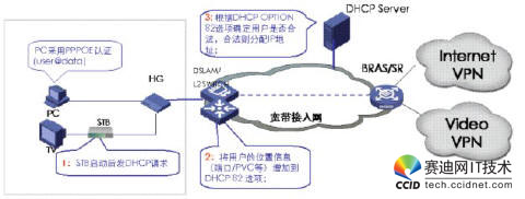 當(dāng)網(wǎng)絡(luò)設(shè)備收到STB的DHCP請(qǐng)求報(bào)文時(shí),需要在報(bào)文后添加OPTION82字段,此時(shí)有兩種模式進(jìn)行DHCP+認(rèn)證,一種是直接把DHCP報(bào)文送給DHCP服務(wù)器,由DHCP服務(wù)器根據(jù)OPT82字段來(lái)判斷該用戶(hù)是否為合法用戶(hù),從而決定是否為其分配IP地址。另一種是DHCP報(bào)文先送到BRAS,由BRAS將OPT82字段放到RADIUS的一個(gè)子域里,通過(guò)RADIUS服務(wù)器來(lái)進(jìn)行用戶(hù)合法性認(rèn)證,若用戶(hù)合法,再由DHCP服務(wù)器分配IP地址。