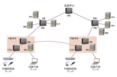 單級系統(tǒng)組網(wǎng)架構(gòu)如上圖所示。主要包括前端單元PU、客戶端單元CU、中心平臺(包括CMU、VTDU、NRU)以及支撐系統(tǒng)(包括AAA、ULS和NMS),各部分均接入IP