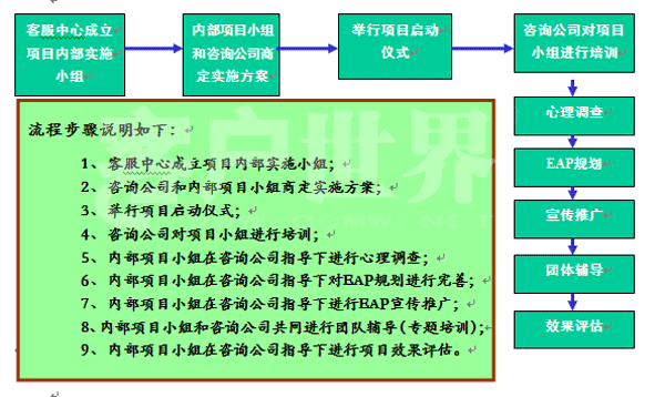 2007年11月,中國移動江蘇公司客戶服務(wù)中心EAP計(jì)劃正式啟動,這是中心為全體員工獻(xiàn)上的一份特別的“精神福利”。 EAP(Employee Assistance Program),中文被譯為“員工幫助計(jì)劃”,是由組織為其成員設(shè)置的一項(xiàng)長期的、系統(tǒng)的援助和福利計(jì)劃。它源于20世紀(jì)40年代的美國,目前美國中型和大型企業(yè)的EAP普及率為60―70%,英國有將近113個組織提供EAP服務(wù)、2200萬員工享受EAP服務(wù),而在我國近年來也有許多企業(yè)開始運(yùn)用EAP服務(wù),中國陸續(xù)召開了三屆EAP年會,越來越多的企業(yè)開始關(guān)注員工的心理健康。