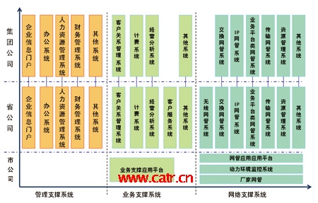 從系統(tǒng)部署來(lái)看,目前各大運(yùn)營(yíng)企業(yè)都以集團(tuán)與省公司為主要的建設(shè)與管理維護(hù)單位,建成了集團(tuán)與省兩級(jí)模式的支撐系統(tǒng)。集團(tuán)公司的系統(tǒng)主要提供面向全公司的企業(yè)管理、經(jīng)營(yíng)分析等功能;省公司從職能管理單位逐步轉(zhuǎn)向了兼顧管理、生產(chǎn)的單位,具有了越來(lái)越多的生產(chǎn)職能,在運(yùn)營(yíng)支撐系統(tǒng)建設(shè)中的作用較為突出,一般情況下,在遵循集團(tuán)公司的總體指導(dǎo)思想下,可自行規(guī)劃與建設(shè)本省的支撐系統(tǒng);市公司的生產(chǎn)職能有所削弱,主要負(fù)責(zé)市場(chǎng)營(yíng)銷、客戶支撐以及設(shè)備的現(xiàn)場(chǎng)維護(hù)等工作,因而主要是支撐系統(tǒng)的使用單位。