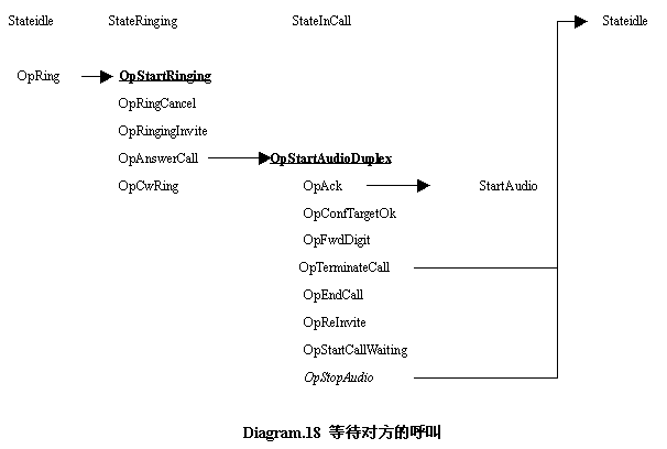 當(dāng)用戶進(jìn)入Idle狀態(tài)以后,如果系統(tǒng)接收到一個INVITE消息,系統(tǒng)將進(jìn)入Ring狀態(tài),并且進(jìn)入Opring操作中,這個時(shí)候硬件設(shè)備將播放振鈴聲,這個時(shí)候如果用戶決定摘機(jī)通話,那么offhook事件就會產(chǎn)生,同時(shí)OpAnswerCall將使?fàn)顟B(tài)機(jī)進(jìn)入InCall狀態(tài),向主叫發(fā)送200響應(yīng)消息,同樣RTP/RTCP通道打開,開始通話,如果通話完畢,雙方掛機(jī),那么互相發(fā)送SIP