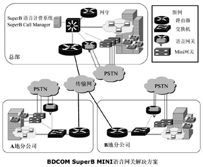 根據(jù)西北石油公司各地分公司電話全部是PSTN直線電話,沒有單位內(nèi)部的PBX,不能通過語音網(wǎng)關把這些直線電話統(tǒng)一接入到IP網(wǎng)絡上這一實際情況,方案提供方博達公司提供了一款小型BDCOM SuperB Mini語音網(wǎng)關,來解決PSTN程控電話統(tǒng)一接入IP語音網(wǎng)絡的問題。使用BDCOM SuperB Mini并結(jié)合西北石油公司組建的企業(yè)內(nèi)部VoIP網(wǎng)絡,克服了傳統(tǒng)語音網(wǎng)關解決方案的不足和缺點。