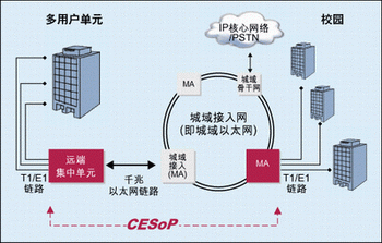 對于擁有眾多用戶的樓宇或校園業(yè)務(wù),運營商可能需要在靠近客戶的地方裝設(shè)遠(yuǎn)端集中器。遠(yuǎn)端集中器集中提供給該樓宇內(nèi)客戶的TDM和/或分組業(yè)務(wù),使用電路仿真并通過點到點連接將業(yè)務(wù)傳回最近的城域網(wǎng)絡(luò)接入點。