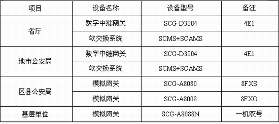 在區(qū)縣局,可采用數(shù)字E1中繼網(wǎng)關(guān)SCG-D3004或采用模擬語音網(wǎng)關(guān)(SCG-A8000);當話務(wù)量不是很高時,可采用模擬語音網(wǎng)關(guān)與用戶原有的